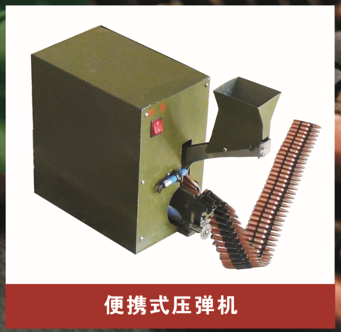 产品说明: 针对目前我军7.62mm机枪弹链大都采用人工压弹效率低下,劳动强度大及配置的传统人工手摇式压弹机需双人合作、压弹速度较慢的现状,很大程度上拖延了战备转换时间,影响部队的快速出动问题,军鹏特种装备有限公司根据部队调研,深入了解市场需求,研制便携式压弹机。