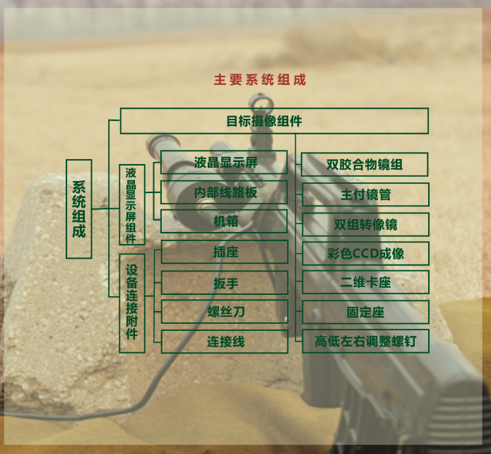 该系统是利用光技术,将远处的目标反应到显示器上,教练员通过目标相对于十字线位置的晃动范围来判断射手是否存在问题。该系统昼夜通用、多枪种通用、贴近实际、实用性强、使用方便,基本解决了当前部队夜间用手电光照射的方法寻找瞄准点,射手和教练员均难以判断准星的问题。